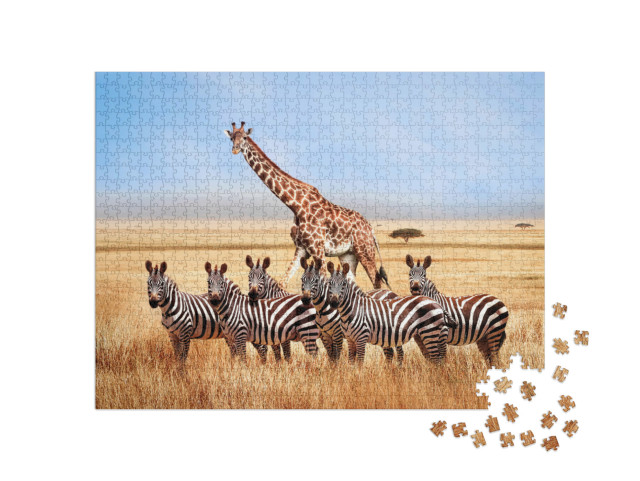 Puzzle « Groupe de zèbres et de girafes dans la savane africaine, Tanzanie »