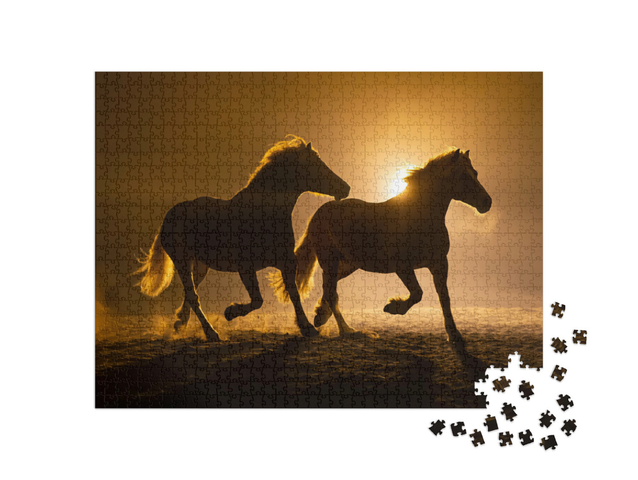 Puzzle « Silhouette de deux chevaux Haflinger au galop dans l'atmosphère du soir »