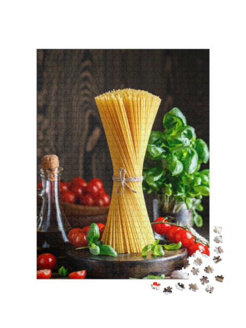 Puzzle « Spaghetti, basilic et tomates en arrière-plan »