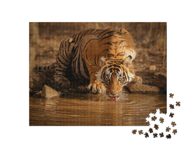 Puzzle « Tigre dans la nature : un tigre mâle boit de l'eau au Rajasthan, Inde »