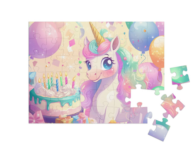 Puzzle « La licorne Bella fête son anniversaire avec un gâteau et des ballons »